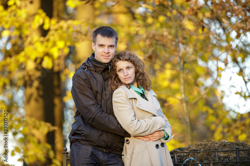 Beautiful romantic couple embracing outdoors. Early fall.
