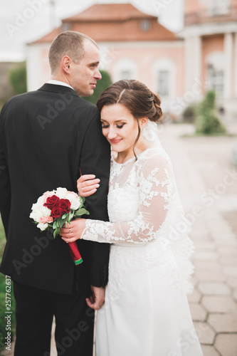 Beautiful romantic wedding couple of newlyweds hugging near old castle