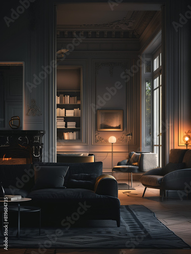 interior, design, room, furniture, modern, apartment, home, decor, luxury, style, house, sofa, elegant, wall, living, nobody, classic, floor, architecture, lamp, indoor, light, table, background, black, white, lounge, vintage, render, empty, frame, contemporary, wood, parquet, carpet, comfortable, retro, window, three-dimensional, fireplace, armchair, lifestyle, wooden, living room, studio, couch, pillow, cosy, space