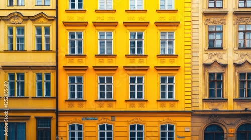 Beautiful row of old yellow buildings with windows and balconies