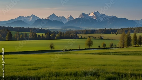 beautiful rural landscape in Bavaria with mountain range and meadow at springtime Generative AI