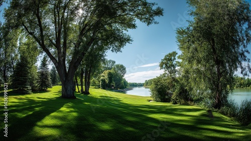 Beautiful scene of a sunny day showing lush green grass spread around a serene lake, with tall trees adding to the natural beauty, taken with a wide-angle lens. Tranquil and refreshing nature view.
