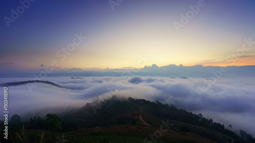 Beautiful scenery of the Po ku de viewpoint a sea of mist in the morning with the movement of the fog covering the Mountain. Tourism enjoy the natural beauty Mae Chaem, Chiang Mai, Thailand.