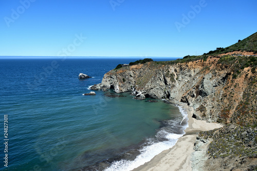 sea, beach, coast, ocean, water, landscape, blue skies, nature, coastline, shore, summer, travel, bay, cliff, seascape, rock, vacation, wave, pacific coast, pacific ocean, highway, greengrass, clear day, journey, trip, holiday, tour tourism, beautiful, panorama, background, horizon, relaxation, recreation, stone, stormy, road, scenic view, bright, open, picturesque, view, calm, empty, serene, california, us, us, america