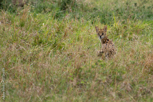 Beautiful serval cat sitting on the grass in the Masai Mara national reserve in Kenya, Africa