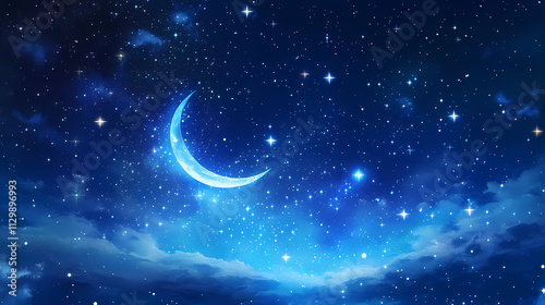 beautiful, shimmering, aurora, borealis, dark, blue, sky, glittering, star, crescent, moon, aethereal, cosmic, iridescent, illustration