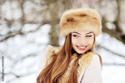 fashion, winter, woman, model, girl, hair, hat, stylish, young, glamour, reddening, make up, polish, human, white, clothes, copy space, complexion, adult, shy, fur, lip, smile, bright, caucasian, female, smooth, posing, portrait, elegant, cute, lady, face, trendy, person, long, elegance, sensuality, beautiful, brunette, visage, graceful