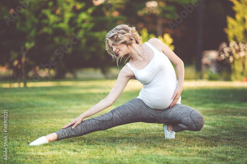 Beautiful slim sportive pregnant girl is doing sports on green grass