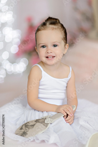 Beautiful small girl in white dress posing indoor.