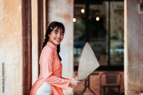 Beautiful smile of the young Asian woman wearing Ao Dai Vietnam traditional dress
