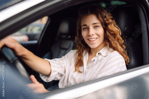Beautiful smiling woman driving a car. The driver is a woman driving. Summer outdoor portrait. Car travel, lifestyle concept.