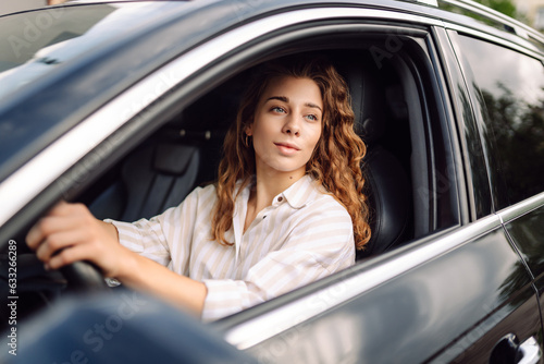 Beautiful smiling woman driving a car. The driver is a woman driving. Summer outdoor portrait. Car travel, lifestyle concept.