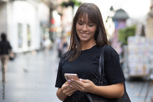 Beautiful smiling woman in black shirt texting on smartphone on street in city center