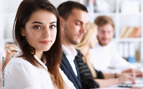 Beautiful smiling woman portrait with group of people listen carefully during seminar. Study event client conversation job customer support service case hear in court leader performance concept