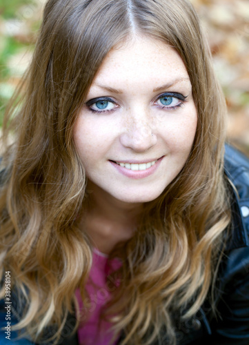 alone, attractive, beautiful, beauty, blue eye, caucasian, emotion, face, female, girl, glamour, coiffure, happiness, lifestyle, lip, look, person, positive, sensual, sexy, smiling, woman, young, cold, autumn, weather, park, walk, blur, close, make-up, portrait