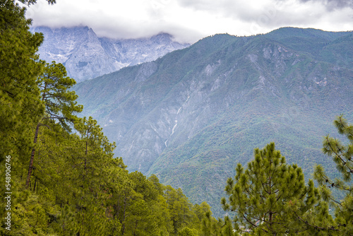 Beautiful snow mountain view behind the tall pine trees over Tiger Leaping Gorge Mountain