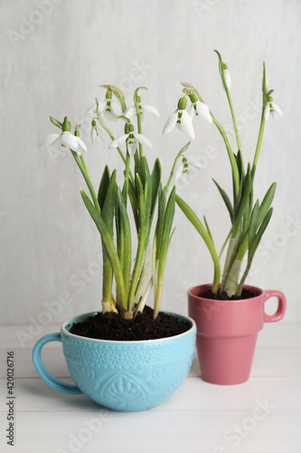 pot, grow, flower, beautiful, bloom, flora, green, background, design, floral, nature, plant, object, blossom, season, spring, white, march, day, fresh, light, holiday, life, woman, celebration, romantic, pure, creative, gift, winter, first, snowdrop, snowdrop, grey, wooden, table, turquoise, ground, planted, pink, cup, early, decor, decoration, colours, bright