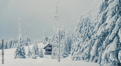 Beautiful snowy fir trees in frozen mountains landscape with house on north. Christmas background with tall spruce trees covered with snow. Alpine ski resort. Winter greeting card. Happy New Year