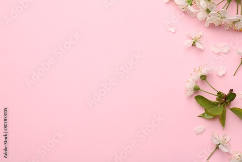 Beautiful spring tree blossoms and petals on pink background, flat lay. Space for text