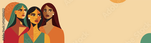 Beautiful strong women of different skin colors stand together on beige background. Vector template abstract banner. For gender equality holiday, women's day, women's health, women's empowerment