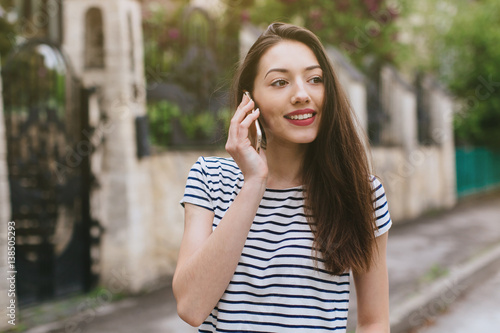 Beautiful stylish and fashionable girl calling in the street.