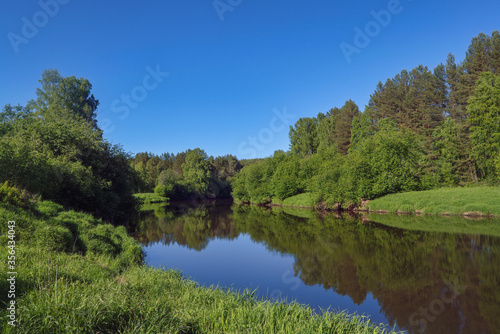 Beautiful summer landscape, forest trees are reflected in calm river water against a background of blue sky.
