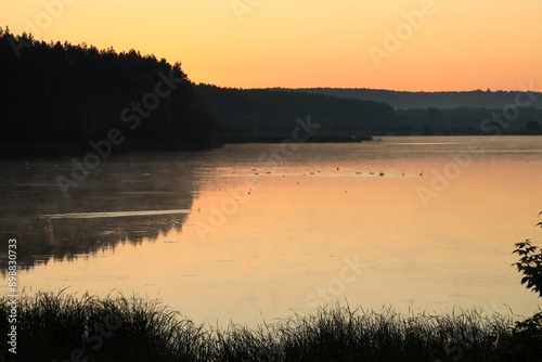Beautiful sunrise at a foggy wide river