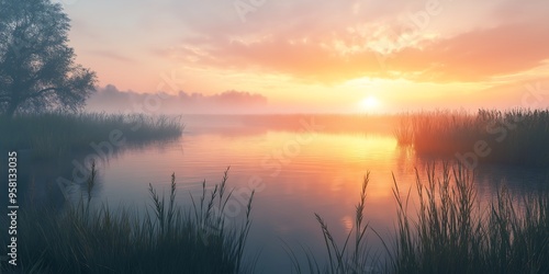 Beautiful Sunrise Over a Tranquil Marshland with Misty Waters, Tall Grasses, and a Reflective Sky