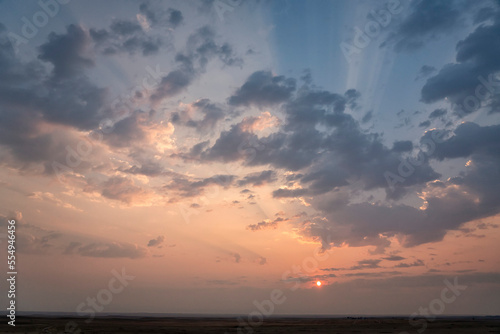 Beautiful sunrise over the prairies of Saskatchewan. Beams of light shine through the clouds, Grasslands National Park; Saskatchewan, Canada