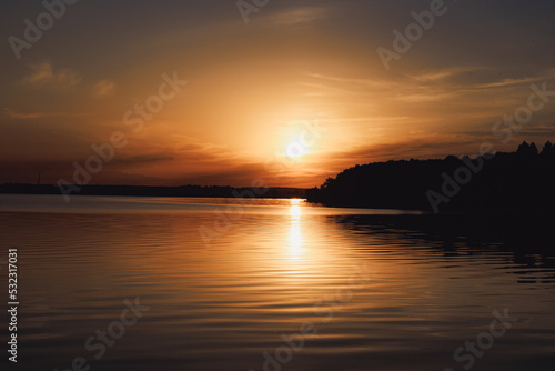 Beautiful sunset of a warm summer evening on the shore of a quiet lake