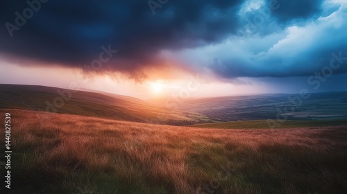 Beautiful sunset over rolling hills with dramatic clouds in the sky. Nature offers peace and stunning views at dusk.