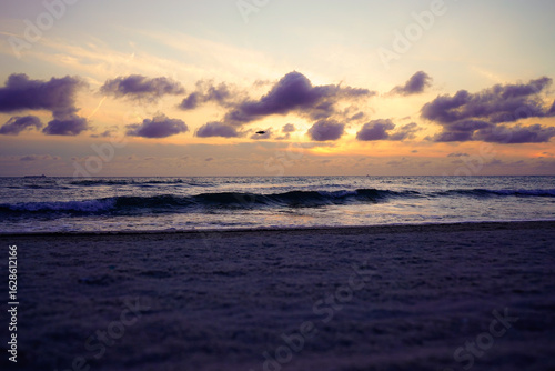 Beautiful sunset over the sea with purple and orange skies. The shore of the Baltic Sea in 18586 Göhren on the island of Rügen