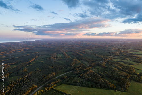 Beautiful sunset over the small town. Fields and trees around. Aerial photography.