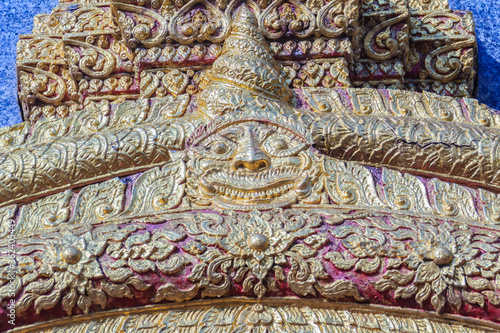 Beautiful sun-shaped human faces carving on the wall of the pagoda in the Buddhist temple, Chiang Mai, Thailand.