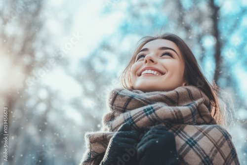 Beautiful sweet girl smiling, standing in winter forest or snowy park. She has happy relaxed face. Woman enjoying walk, breathing fresh frosty air