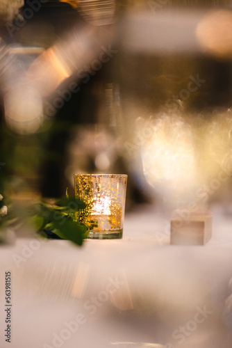 Beautiful table setting decorated with lighted candles, tableware, flowers, accessories for a party, wedding reception, gala banquet or other holiday event.