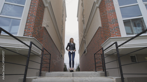 Beautiful thoughtful blond woman stands between two houses. wide angle