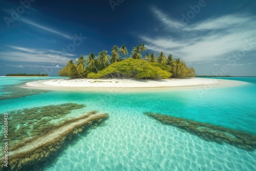 Beautiful tropical island in the Maldives with blue sky and sea for vacation backdrop in the natural world. Generative AI