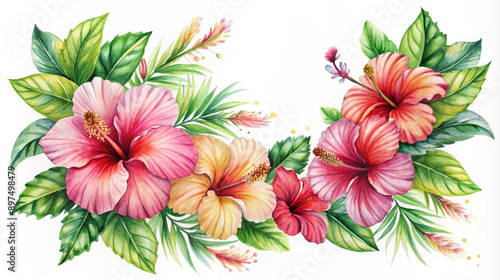 Beautiful tropical leaves rendered and hibiscus blossoms in watercolor on a white backdrop with blank area for text
