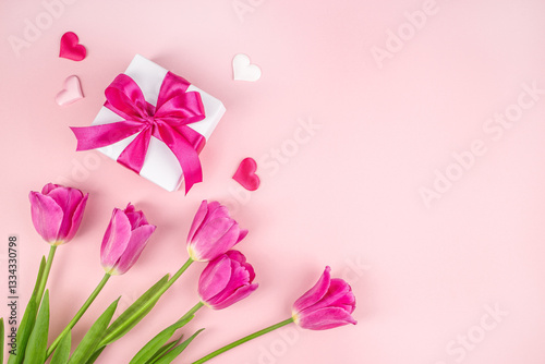 beautiful tulips with gift box hearts on a light pink background. happy mothers day, top view. copy space