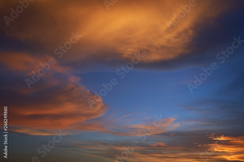 Beautiful vibrant orange cloud and blue sunset sky .