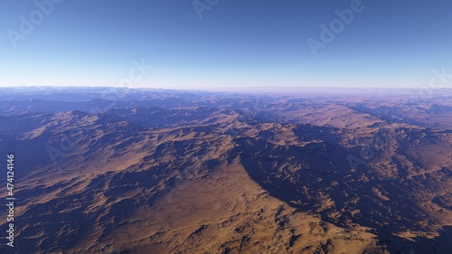 beautiful view from an exoplanet, a view from an alien planet, a computer-generated surface, a fantastic view of an unknown world, a fantasy world 3D render
