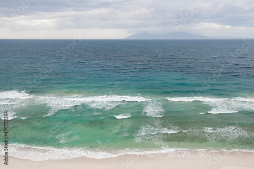 Beautiful view of Cristo Rei Backside Beach or known as Dolok Oan Beach in Dili, Timor Leste. Sea waves background. Aerial view of tropical beach.