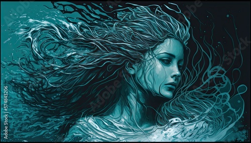 beautiful water elemental woman silhouette, waves, flowing, ocean seafoam, pretty lady on the sea - generative ai