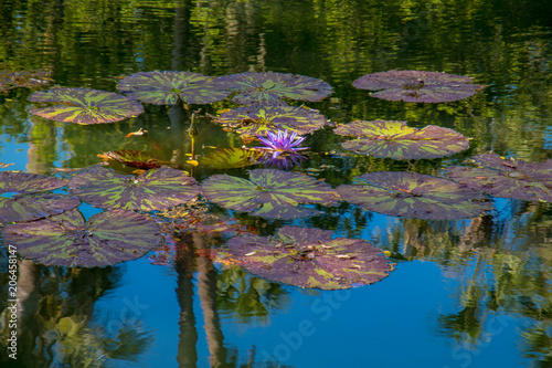 Beautiful water lily and variegated leaves on the surface of the lake. On the watery surface reflection of trees and palm trees.