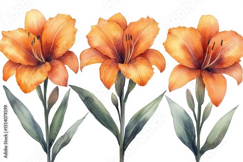 Beautiful Watercolor Illustration of an Orange Daylily on a Clean White Background with Clean Lines and Stylized Details
