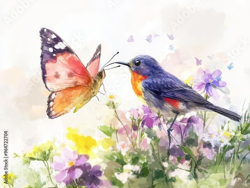 Beautiful watercolor painting of a bird and butterfly amidst vibrant flowers on a soft, dreamy background.