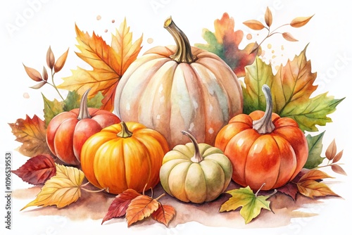Beautiful Watercolor Painting of Pumpkins and Colorful Autumn Leaves on a Crisp White Background, Perfect for Seasonal Decor and Harvest-Themed Designs