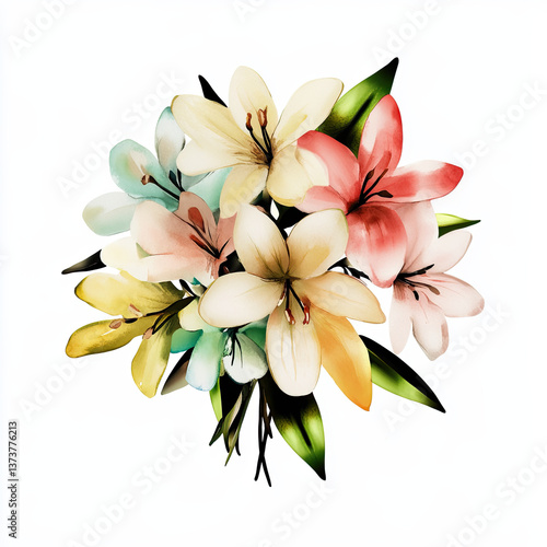 beautiful watercolor rendering of vibrant bouquet featuring various lilies in soft pastel colors, evoking sense of elegance and tranquility