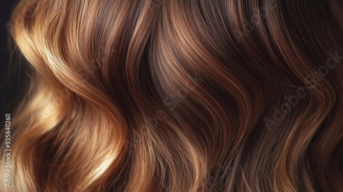 Beautiful wavy hair showcases rich brown tones with radiant golden highlights, capturing natural shine in soft lighting.